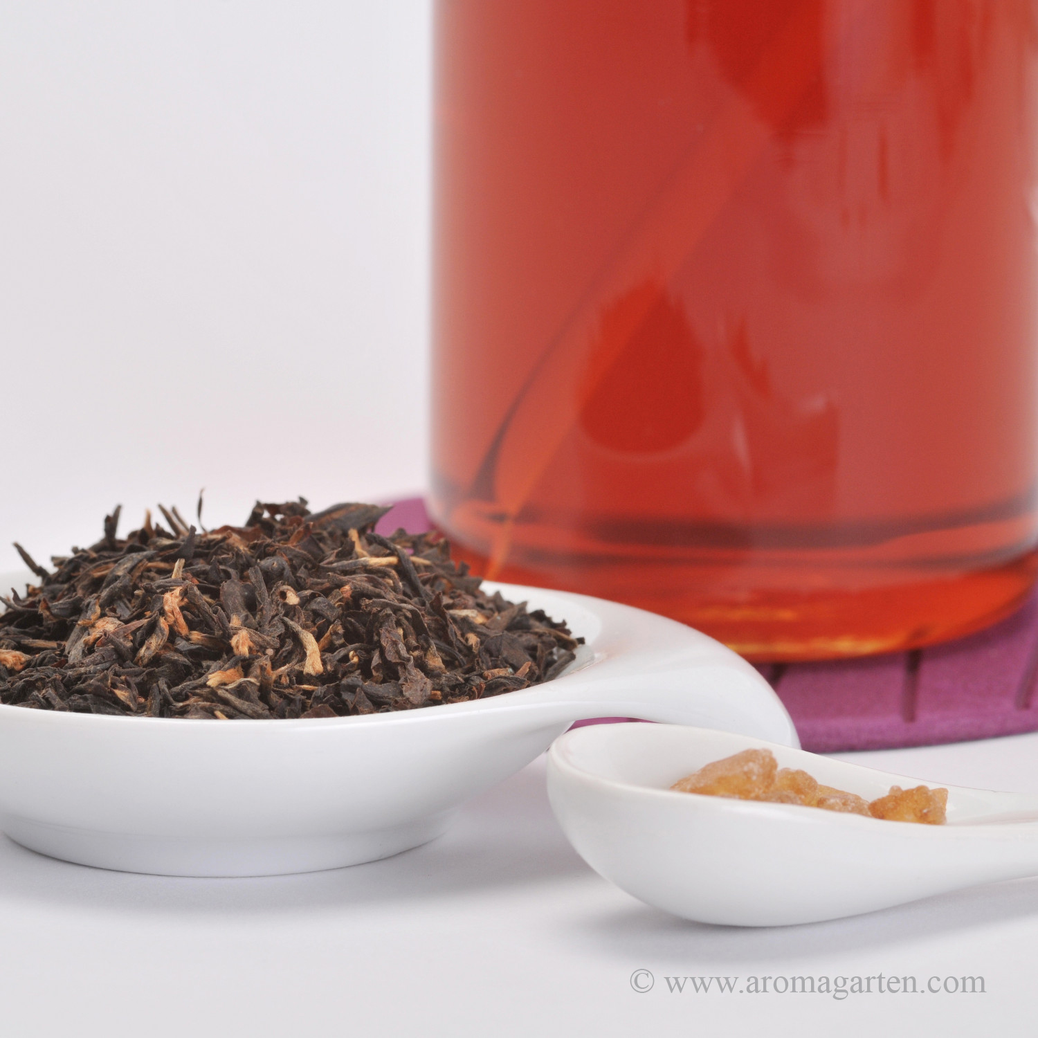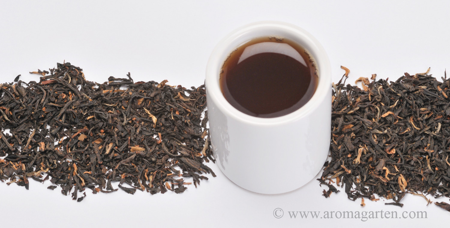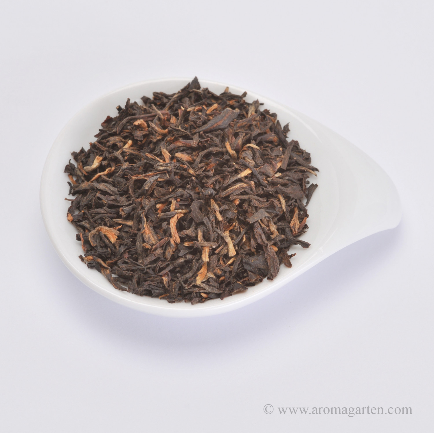 gut gearbeitetes Blatt mit vielen Goldspitzen, malzig, rassig im Geschmack, vollmundig cognacfarbene Tasse, ein Tee für Assam-Genießer.