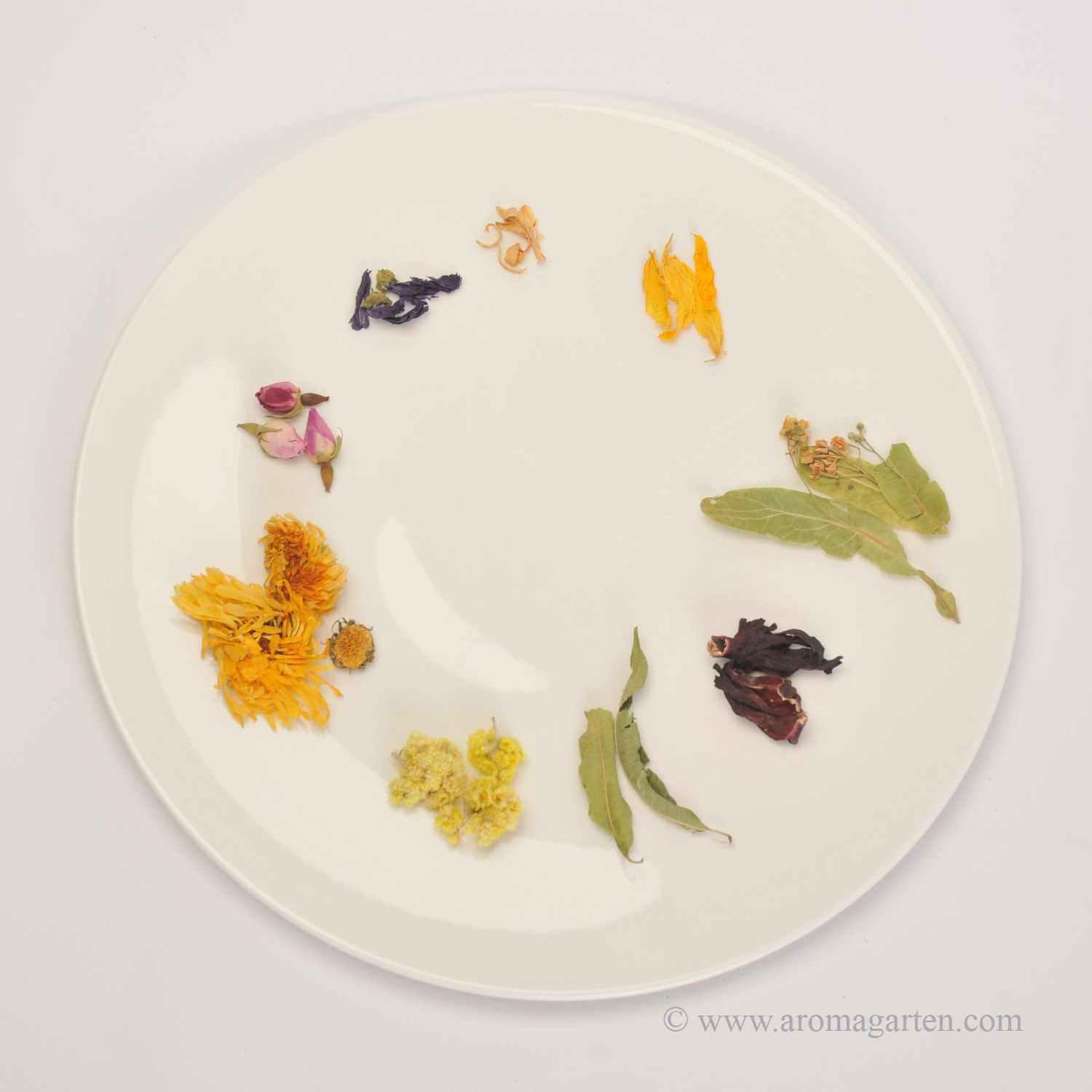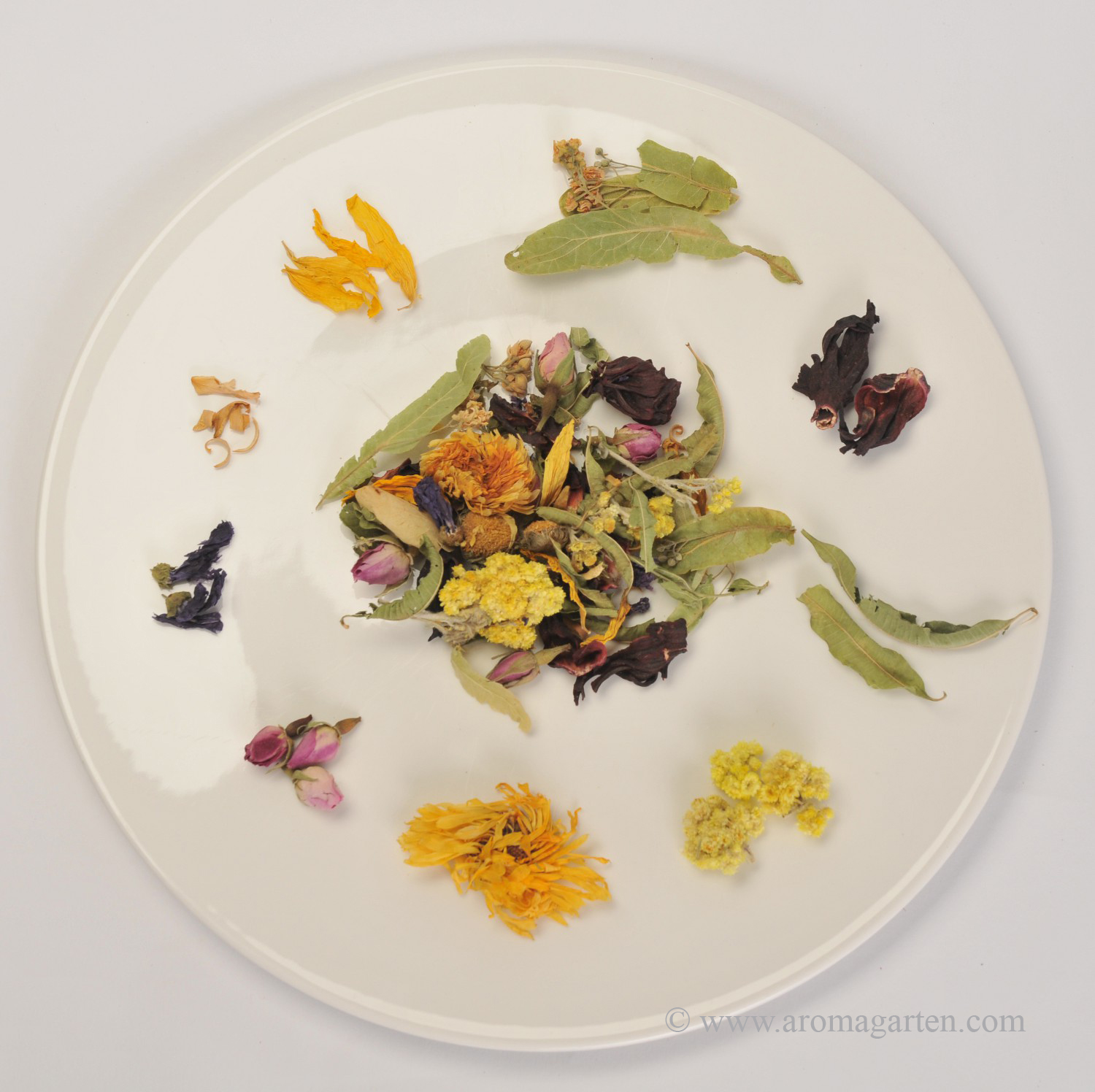 Zutaten: Hibiscusblüten, Verbenenblätter, Lindenblüten, Rosenknospen, Malvenblüten blau, Orangenblüten, Ringelblumenblüten, Sonnenblumenblüten, Katzenpfötchenblüten.