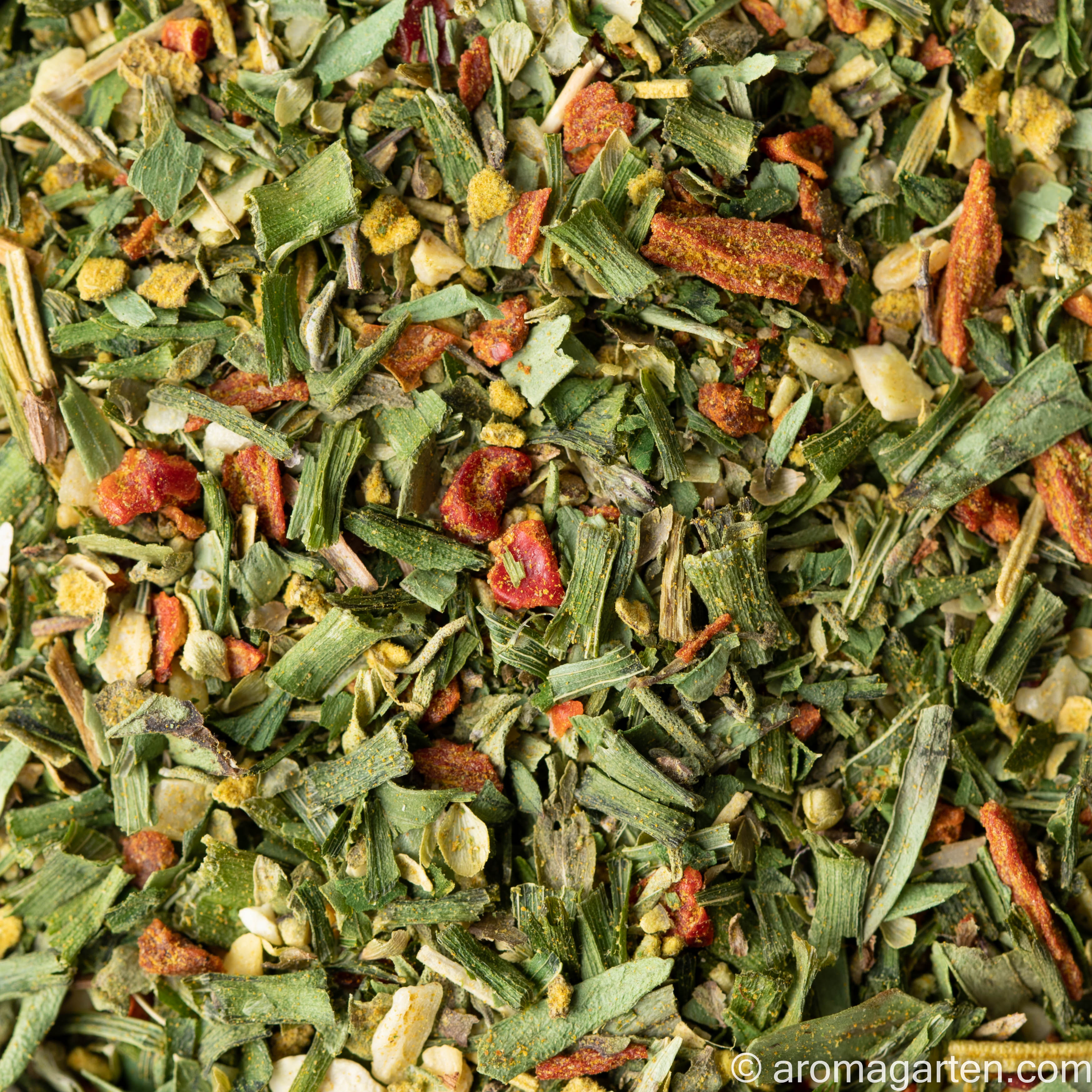 Gewürze: Gewürze (Schnittlauch, Paprika, Zwiebel, Petersilie, Tomatenflocken (Tomatenmarkkonzentrat, Maisstärke), Knoblauch, Thymian, Estragon, Salbei, Pfeffer, Oregano, Rosmarin, SENFKÖRNER, Koriander, Kurkuma, Kreuzkümmel, Bockshornkleesaat, Ingwer, Chilis, Nelken, Fenchel, Piment, Muskatnuss, Zimt, Majoran), Meersalz (12%), Rohrzucker. [kann Spuren enthalten von SELLERIE].