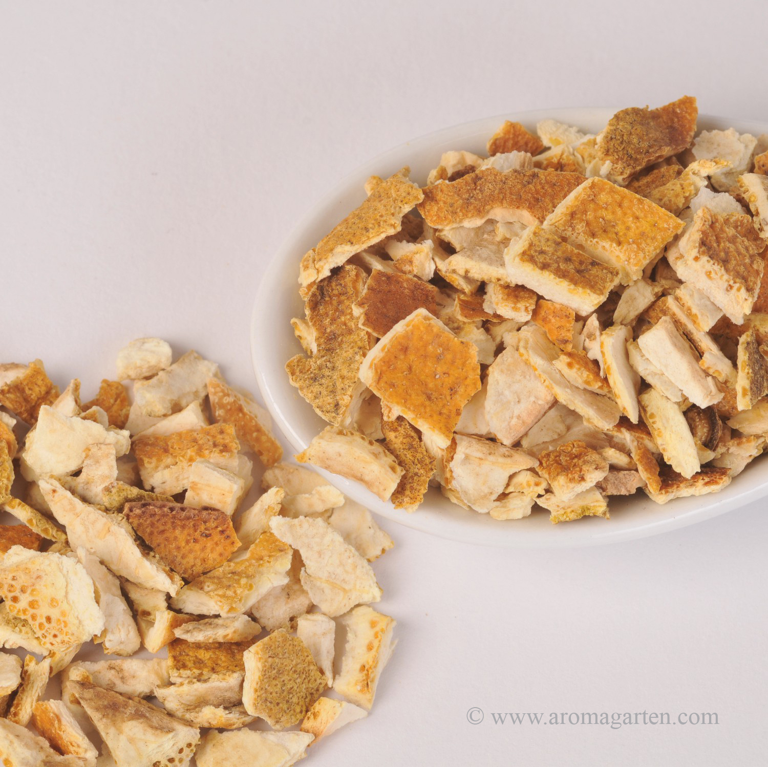 Bio Orangenschalen, geschnitten, für Glühwein, Punsch und zum aromatisieren von Rooibos -, Mate-, Grün- oder Schwarztee.