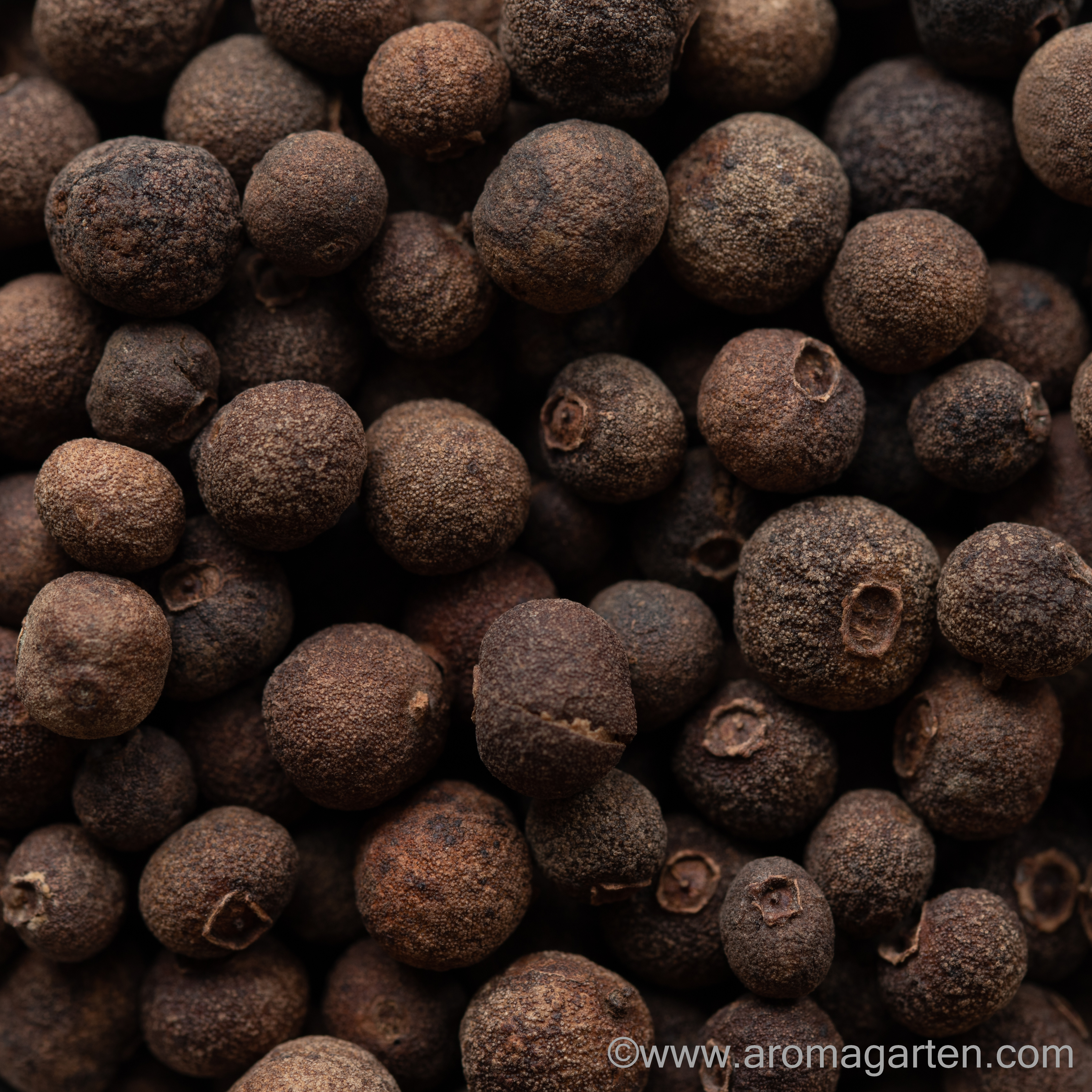 Bei diesem Gewürz handelt es sich um die unreif geernteten und anschließend getrockneten Früchte des Pimentbaumes (Pimenta dioica) aus der Familie der Myrtengewächse (Myrtaceae). Piment hat viele andere Bezeichnungen: Neugewürz, Allgewürz, Nelkenpfeffer, Jamaikapfeffer. Sie verraten schon so einiges über die dunkelbraunen ‚Beeren‘. Ein Neugewürz war es für die Europäer, als es im Zuge der Seefahrten des Columbus aus der Neuen Welt im Laufe der Zeit auf unserem Kontinent bekannt wurde. Die Spanier, auf der Suche nach einem Seeweg nach Indien, hielten es wohl zunächst für Pfeffer und bezeichneten es entsprechend als pimienta. Als Allgewürz erschien es, weil das Aroma in seiner Komplexität an viele andere erinnert. In dieser Vielfalt dominiert jedoch der Anklang an das Aroma der Gewürznelke, deshalb Nelkenpfeffer. Jamaikapfeffer benennt natürlich die Herkunftsinsel. Noch heute kommt ein Großteil des Exports von dort. Der Pimentbaum braucht Vegetationsbedingungen, die lediglich in bestimmten Gebieten Mittelamerikas anzutreffen sind. Weitere Hauptanbaugebiete liegen in Guatemala, Honduras, Mexiko und Brasilien.
