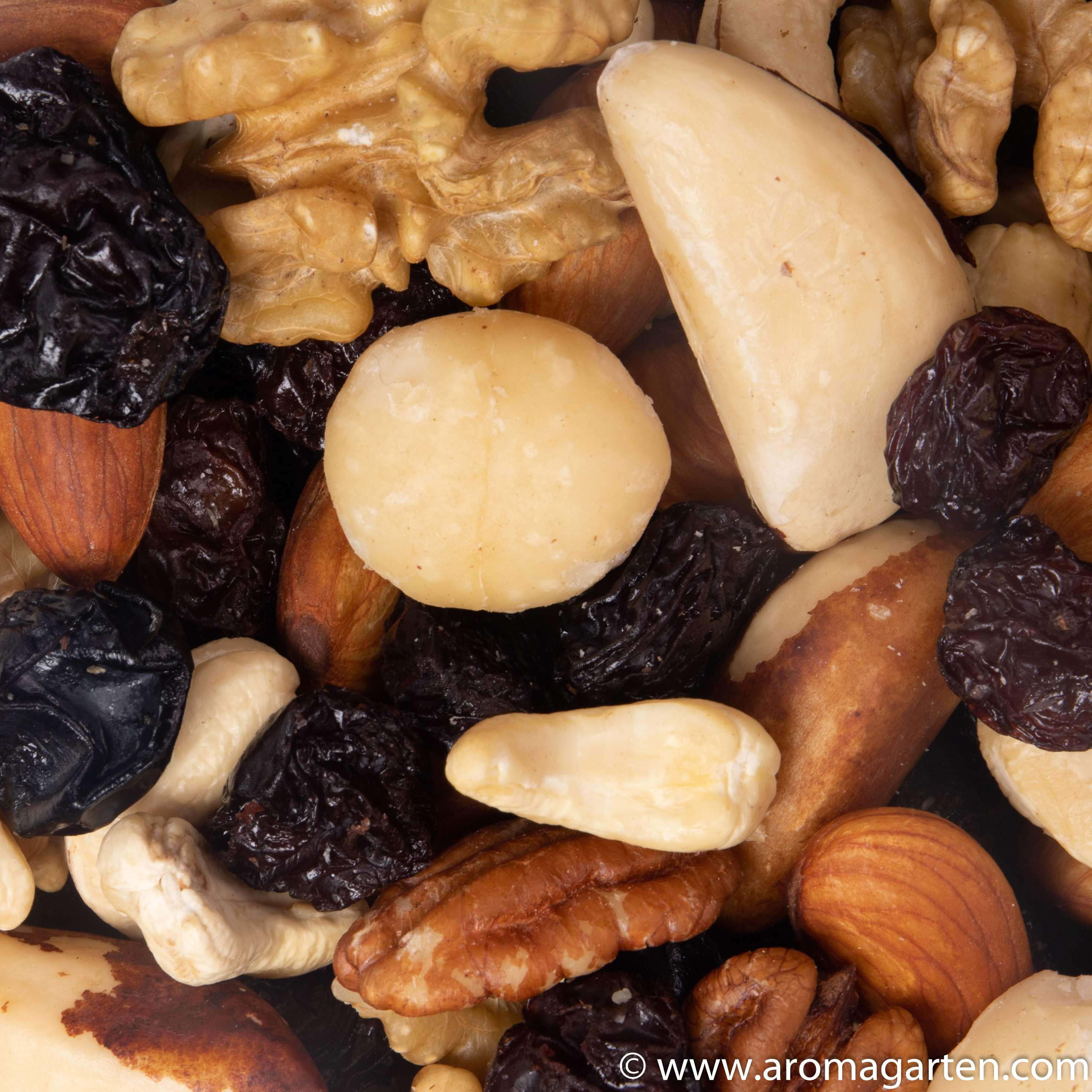 Weinbeeren (kernlose ungeschwefelte getrocknete Trauben, leicht geölt) Cashewkerne*, Mandeln, Walnusskerne, Macadamianusskernen Paranusskerne* und Pecan*.Mengenverhältnis Weinbeeren/Nüsse: ca. 1/2.