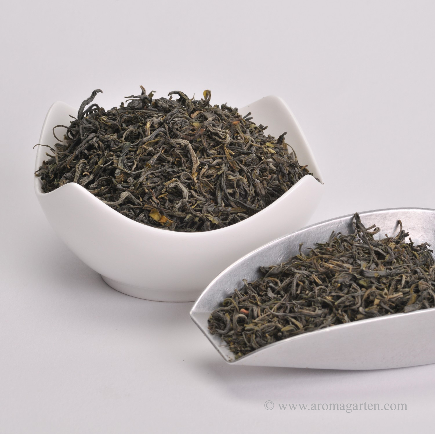 Grüner Tee aus ökologischem Anbau. Aromatischer und dennoch milder chinesischer grüner Tee. Helle, grüne Tasse, wenig bitter.